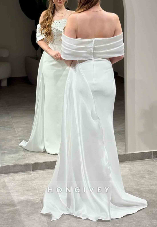 Off the Shoulder Trumpet Side Draping Pleated Rhinestone Evening Gowns