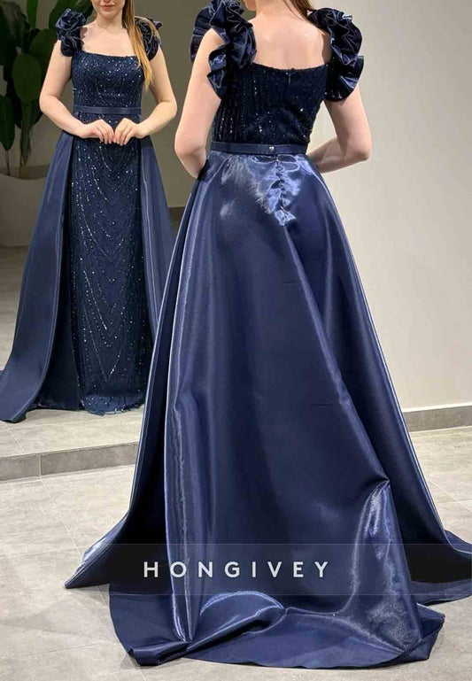 Cap Strap Floor-Length Column Square Beading Detachable Evening Gown