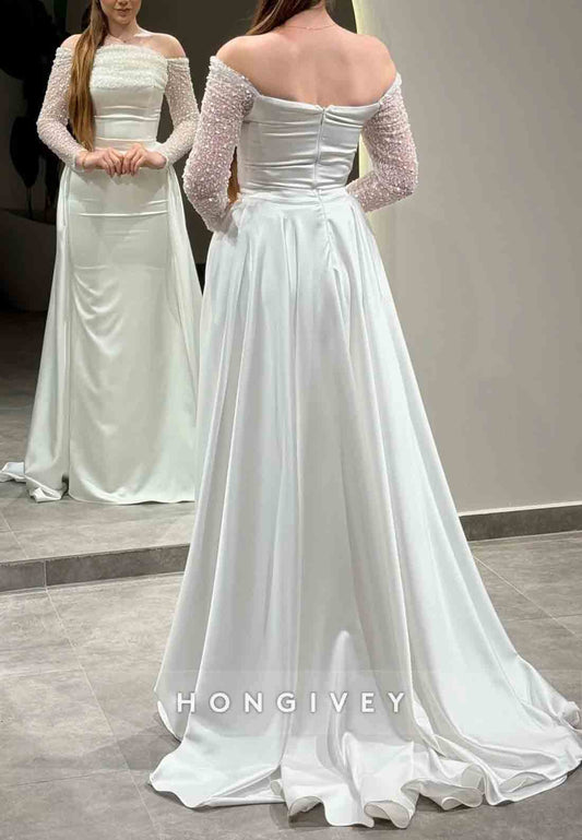 Detachable Column Floor-Length Formal Dresses Off the Shoulder Long Sleeve Beading Evening Gown