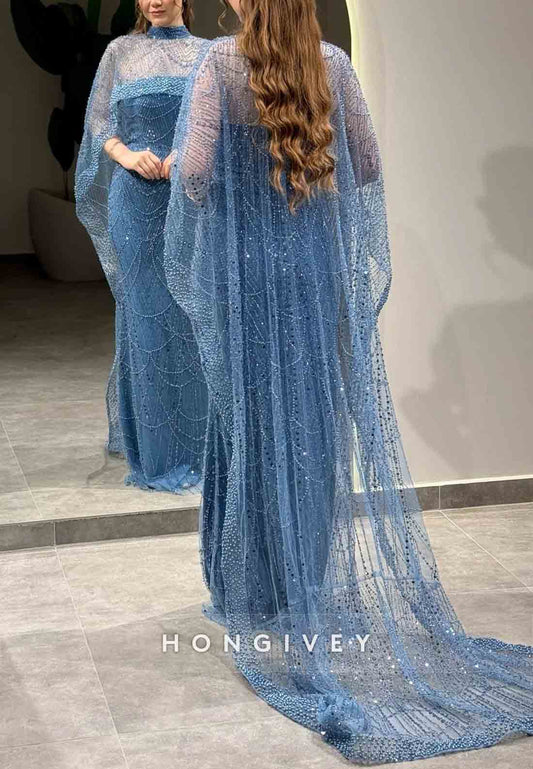 Shawl Halter Floor-Length Sheath Evening Gown Beading Cloak Formal Dresses