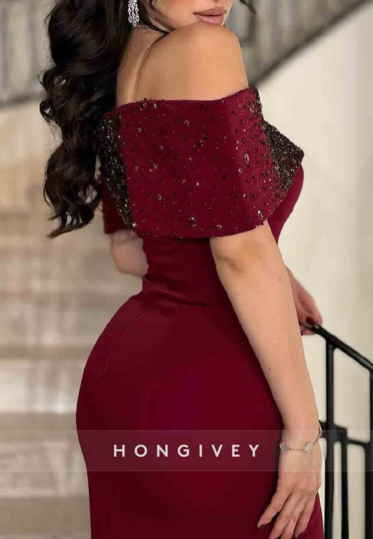 Burgundy Off the Shoulder Column Floor-Length Shawl Beading Evening Gowns