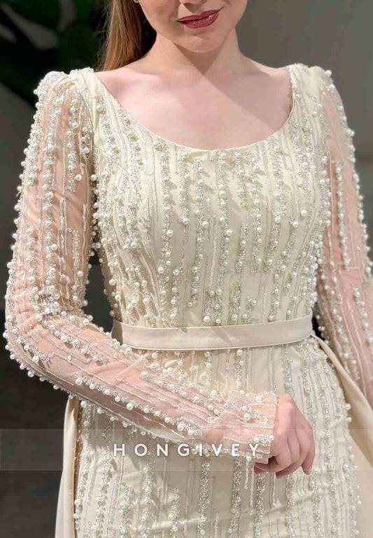 Detachable Long Sleeves Beading Sheath Scoop Evening Gown