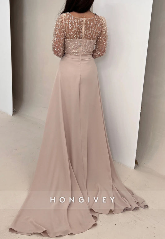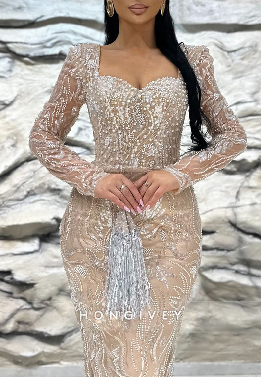 Beading Long Sleeve Scoop Floor-Length Column Formal Evening Dresses