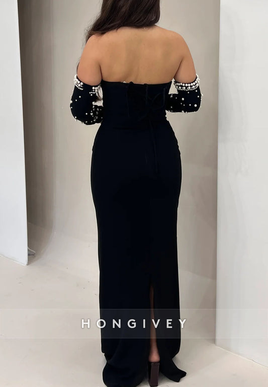 Off the Shoulder Floor-Length Column Long Sleeve Pleated Beading Evening Gown