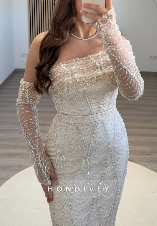 Column Asymmetrical Neck Evening Gown Long Sleeve Beading Ankle-Length Formal Dresses