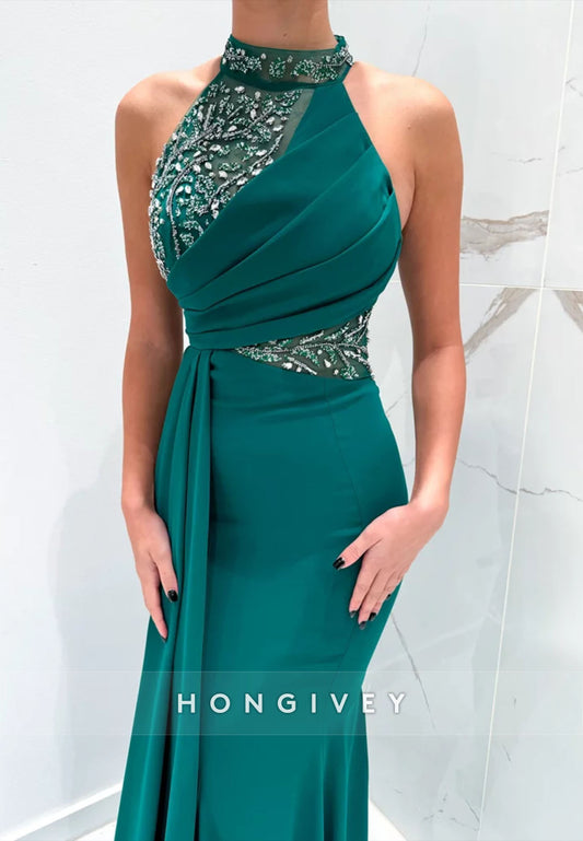 Side Draping Formal Dresses Pleated Beading Halter Trumpet Sleeveless Evening Gown