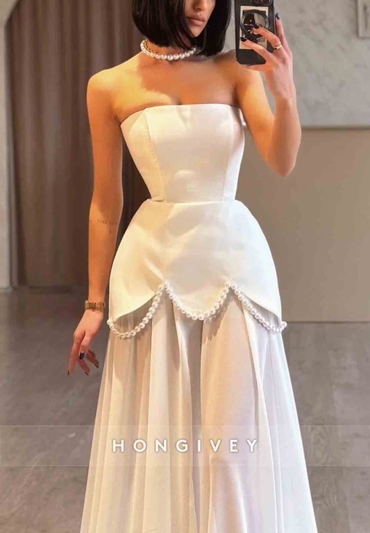 Strapless A-line Floor-Length Pearls Low Back Pleated Evening Gown