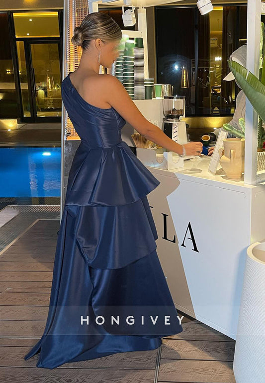 Navy Blue A-Line One Shoulder Satin Asymmetrical Evening Gowns