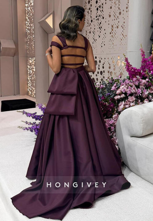 Tie Back A-Line Off the Shoulder Floor-Length Pleated Evening Gown