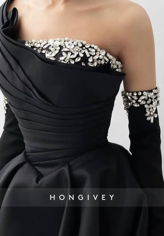 Black Ball Gown One Shoulder Beading Pleated Evening Formal Dresses
