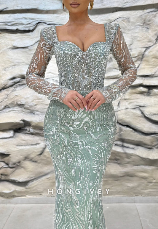 Sheath Formal Dresses Floor-Length Long Sleeve Beading Evening Gown