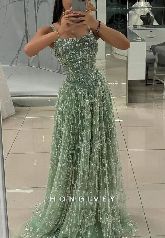 Regular Straps Sleeveless Square Pleated Beading Sweep Train Evening Gown