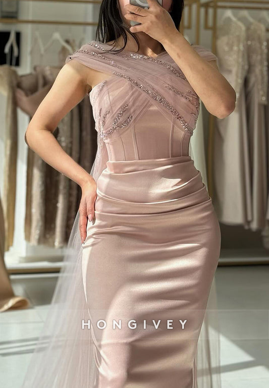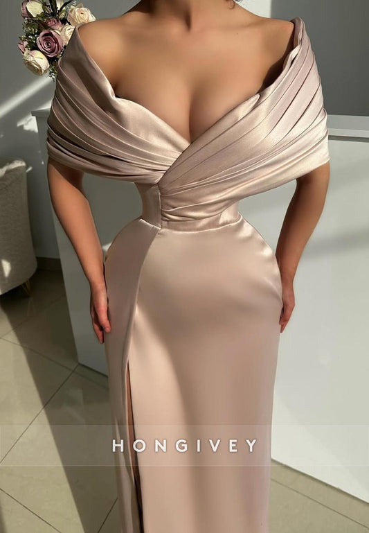 Champagne Satin Off-Shoulder Pleats Mermaid Long Prom Dresses with Split