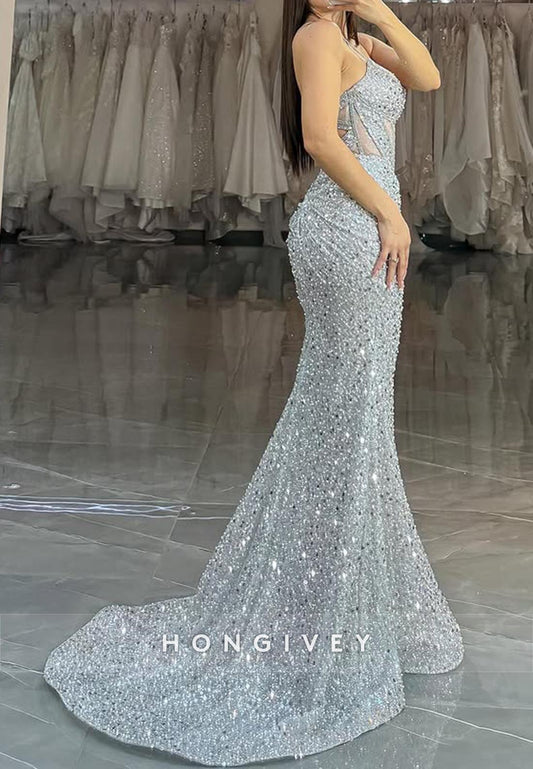 Spaghetti Straps Beads Sparkly Mermaid Prom Formal Dress
