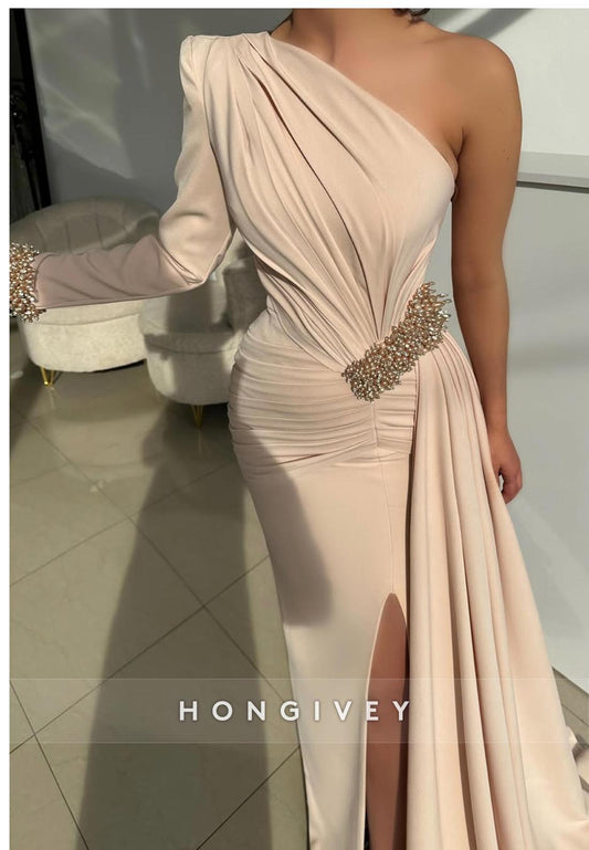 Semi Formal One Shoulder Mermaid Split Pearls Long Evening Prom Dresses