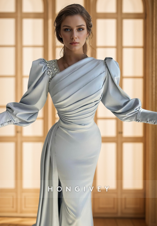 Formal Column Court Train Satin Long Sleeve Pleated Evening Gown