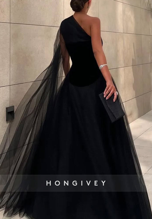 A-line Floor-Length One Shoulder Tulle Black Formal Evening Dresses
