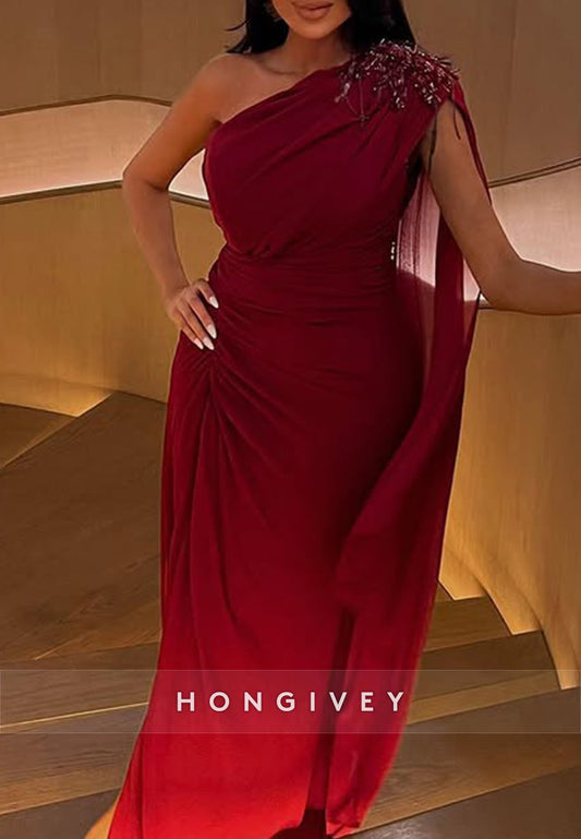 Side Draping Sheath Watteau Train One Shoulder Pleated Split Evening Gown