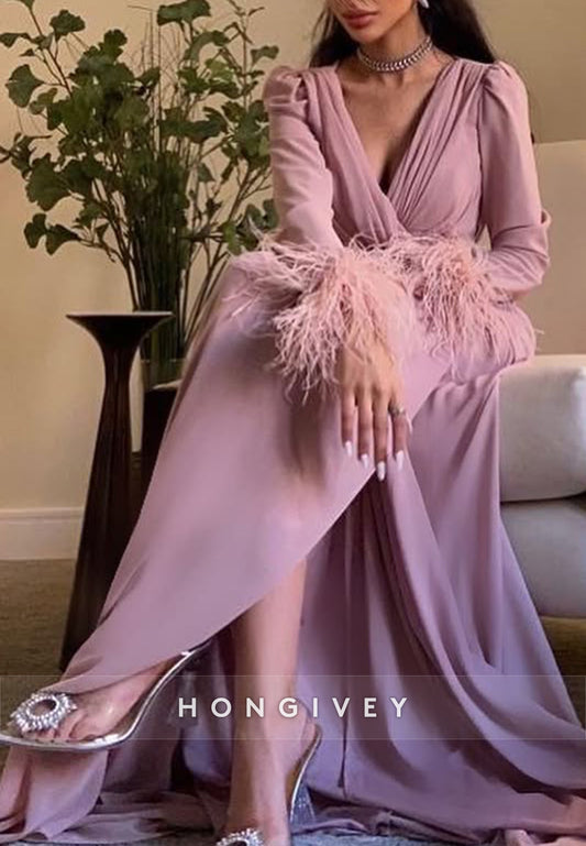 Column Court Train V Neck Long Sleeve Feather Slit Pleated Evening Gown