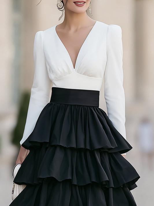 Black White V-Neck Tiered Ruffle Maxi Dress