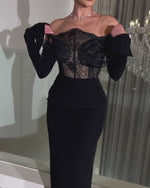 This elegant black sheath gown features an off-the-shoulder neckline that highlights your collarbones with subtle allure. Its bell sleeves add a touch of dramatic sophistication, while the sleek silhouette ensures a refined and timeless look, perfect for any formal evening occasion.