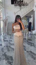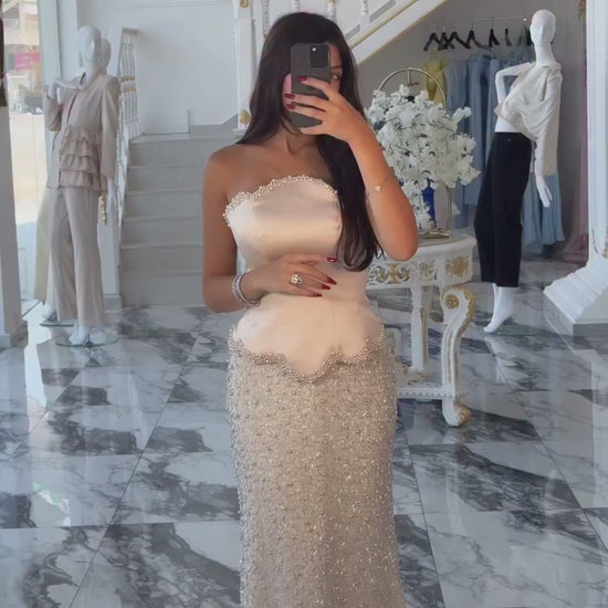 This strapless, floor-length trumpet gown features a sleek satin fabric complemented by a structured corset and delicate beading accents. Designed to contour the figure, it offers an elegant silhouette that exudes refined sophistication, perfect for making a memorable statement at any formal event.