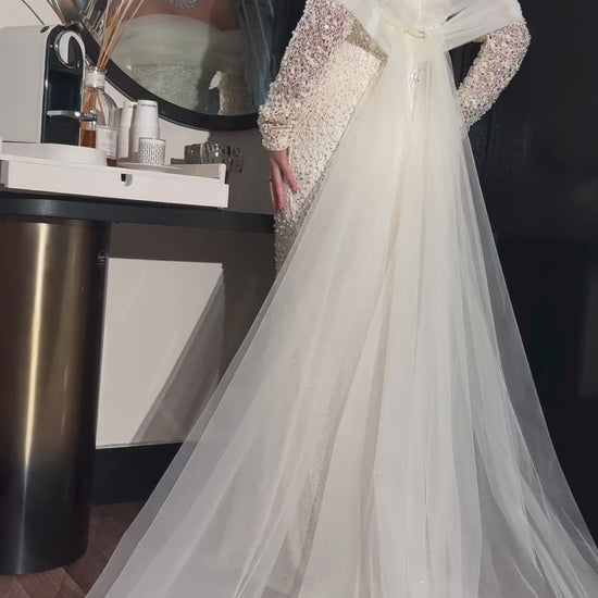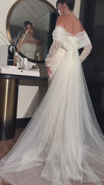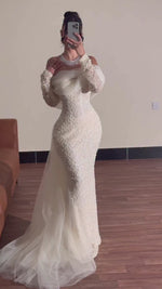 Elevate your bridal look with this off-the-shoulder sheath wedding dress, featuring elegant long sleeves and a graceful low back. Intricately adorned with delicate beading, it offers a refined silhouette that combines timeless sophistication with modern allure, perfect for making a memorable entrance on your special day.