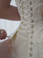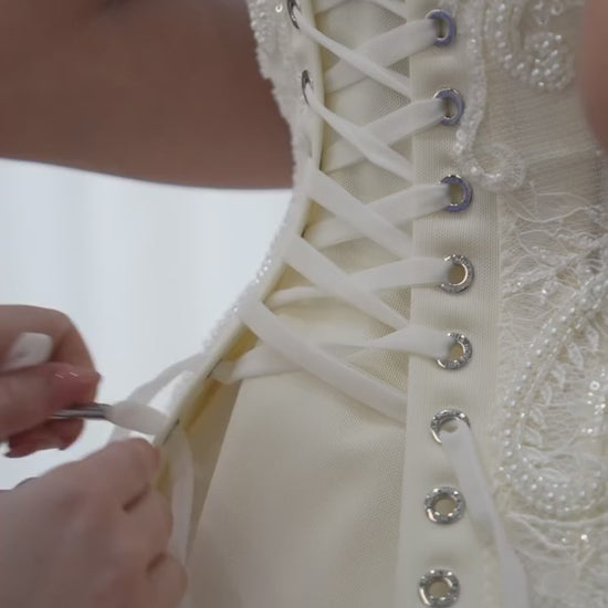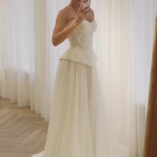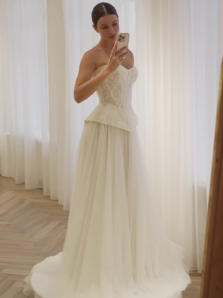 Radiate timeless beauty in this ethereal A-line wedding dress. The delicate tulle skirt creates an airy, romantic silhouette that moves gracefully with every step, while the sweetheart neckline offers classic femininity. A beaded corset provides structured elegance and a flattering fit, and the sweep train adds subtle drama without overwhelming the design. An enchanting choice for the bride seeking refined romance and effortless sophistication.