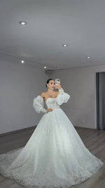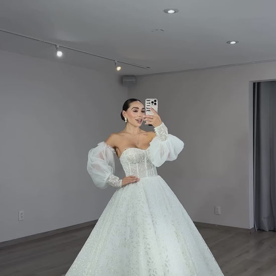 Embrace timeless elegance with this stunning princess wedding dress, featuring a romantic sweetheart neckline and delicate appliqué detailing. The strapless silhouette offers a classic, refined look, while voluminous puff sleeves add a whimsical, fairy-tale charm. Expertly crafted for the modern bride seeking a balance between traditional romance and contemporary sophistication, this gown creates an unforgettable bridal moment.