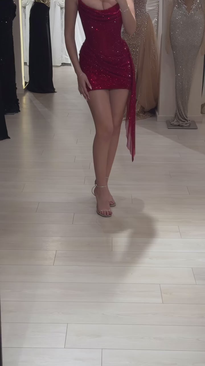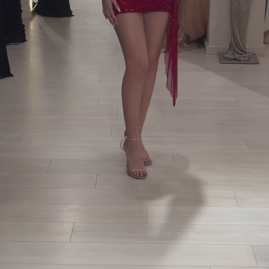 This elegant burgundy mini dress features a strapless neckline with shimmering glitter fabric that adds subtle glamour. Pleated detailing and graceful side draping create a flattering silhouette, making it an exquisite choice for homecoming and special parties.